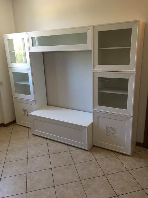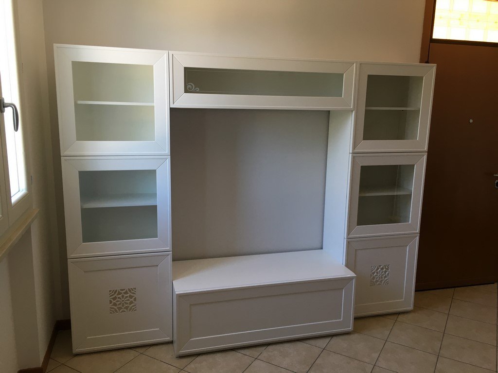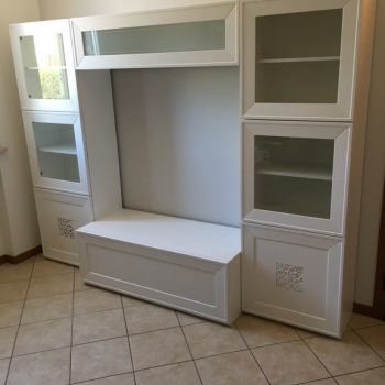 Parete componibile laccata bianco con sotto intaglio in foglia argento